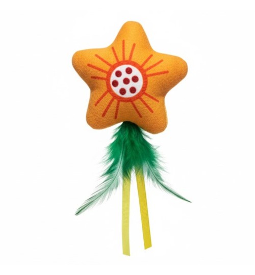 Plush star with catnip, matatabi, and tails (feather and ribbons) for cats. Light and soft for kicking, chasing, and carrying. Offers 5–10 minute runs.