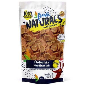 Fresh Naturals Chicken Chips Dog Snacks. Made with 100% animal protein. Sugar-free, gluten-free, and free of hormones and antibiotics. Ingredients: chicken. 100g zip-lock bag.