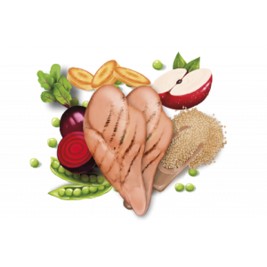 Super premium dog food with fresh chicken as its main ingredient. Suitable for adult dogs of all breeds. 80% animal protein, 60% real meat, 20% fruits and vegetables , and 0% grains. 2.5 kg.