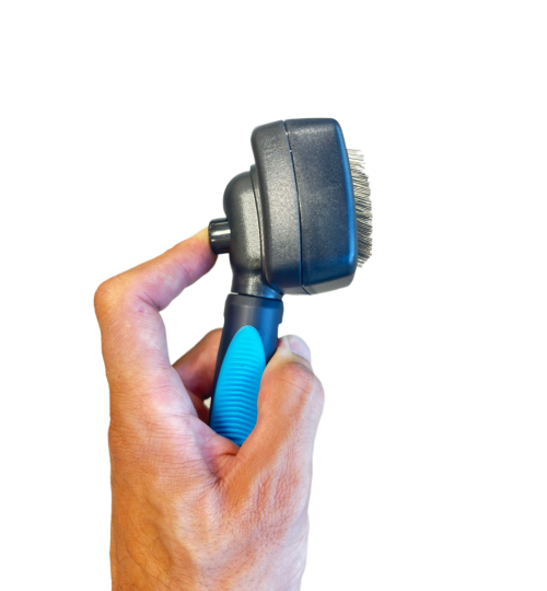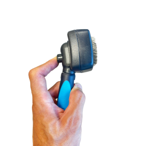Self-cleaning brush for dogs and cats. Effective against tangles. Self-cleaning method: Features a button on the back that, when pressed, removes hair embedded in the bristles. With a non-slip, ergonomic blue handle. Dimensions: 10 x 17.5 cm....