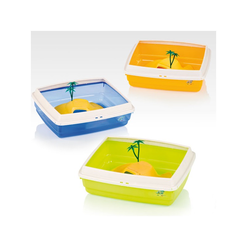 The Creta turtle tank comes in various colors with a white outer frame and a decorative palm tree in the center. Its dimensions are 42 x 33 x 14 cm.