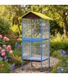 Algeciras A25A cage. Dimensions: 78 x 74.5 x 166 cm. Tower-shaped. Tiled roof. Blue and yellow. Two separate spaces.