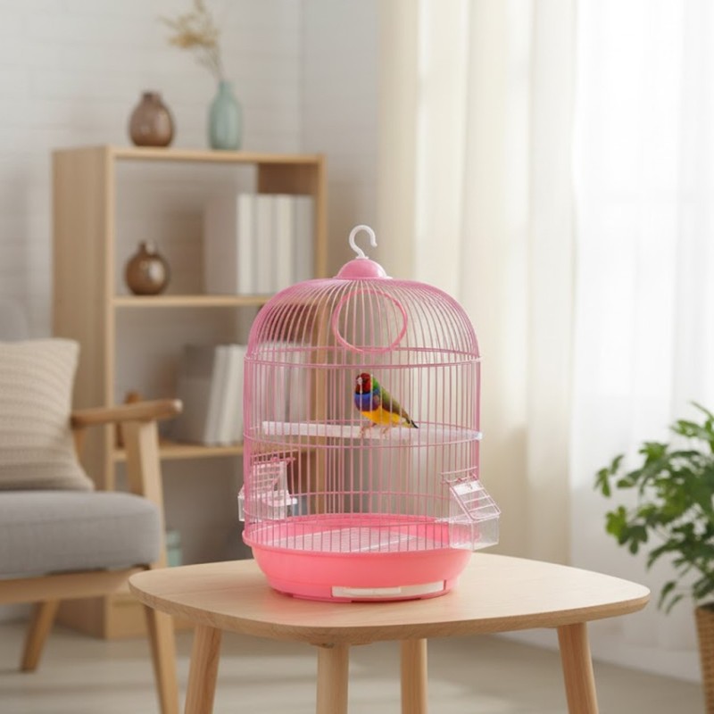 The A309 Coruña model cage is a pink bird cage. It comes with a swing, a feeder, and a waterer. Its dimensions are 33 x 53 cm.
