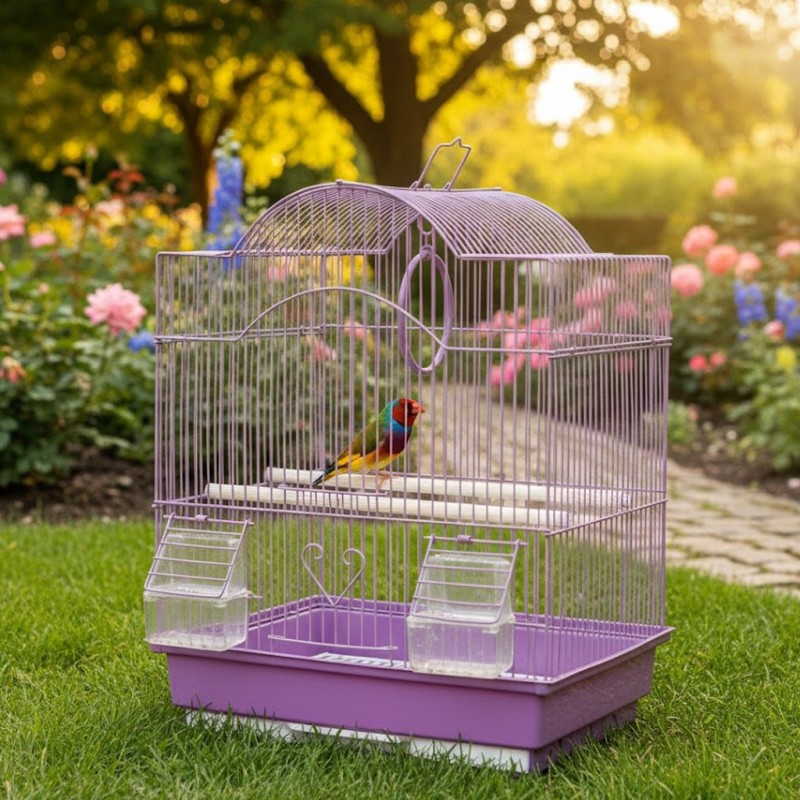 The San Javier model cage is a purple bird cage that includes a swing, two support bars, a food and water bowl. Its dimensions are: 35 x 28 x 46 cm.
