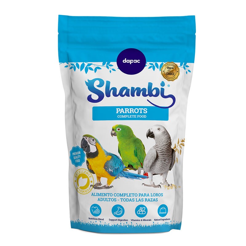 Shambi EXTRA Parrot Mix 2.5kg. New composition: corn, flaked corn, raw black sunflower seed, white sunflower seed, pumpkin seed, flaked wheat, flaked oats, peas, safflower, jumbo shell, raisins, coconut, banana, pineapple, papaya, chili pepper, nuts, and extruded food. NEW DOYPACK FORMAT: Flexible with a bottom fold to keep contents upright. Zip closure, highly resistant. 2.5kg.