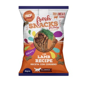 Fresh Snacks lamb bone-shaped dog treats. Made with up to 60% meat and lamb as the main ingredient. Ideal as a snack, treat, or reward. The bag contains 70g. Order in multiples of 6 to receive an outer box.