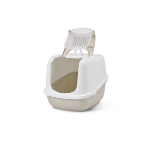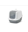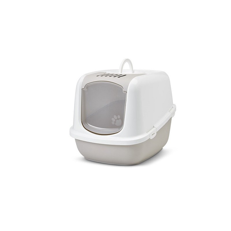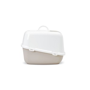 Nestor Jumbo covered litter box with lid and carrying handle. White-cool grey. Removable lid. Activated carbon filter to neutralize odors. Dimensions: 66.5 x 48.5 x 46.5 cm.