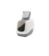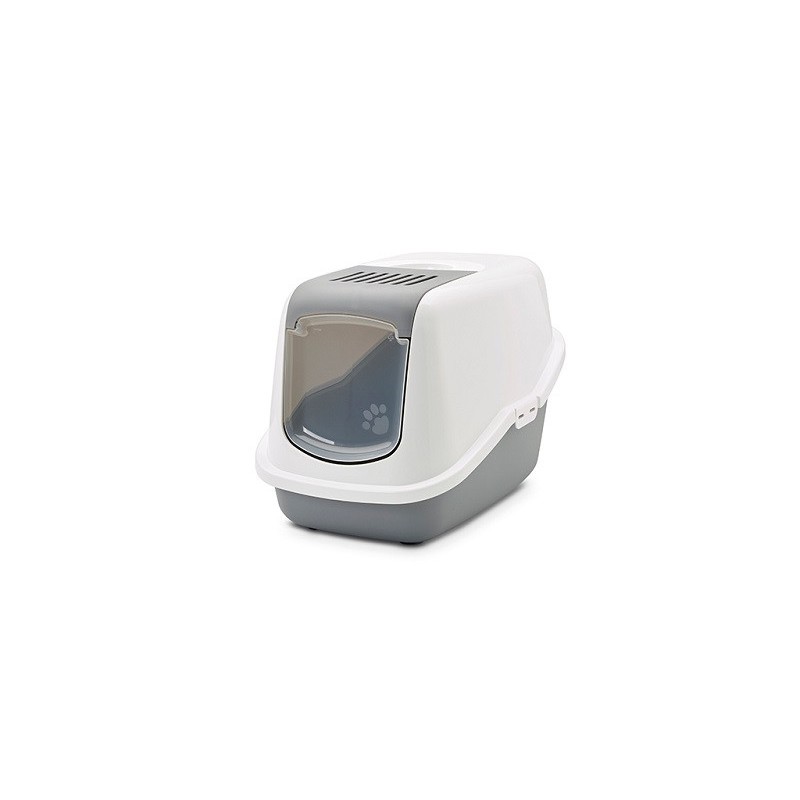 The Nestor white coo grey litter box is a hygienic covered cat litter box with a plastic swing door, built-in handle, and a carbon filter. The latter prevents unpleasant odors from spreading. Dimensions: 56 x 39 x 38.5 cm.