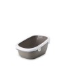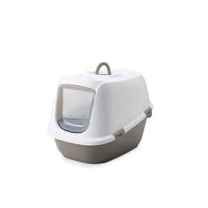 The Leo litter box is a daily hygiene accessory for cats in white and gray tones. It features an activated carbon filter to minimize odors, a swing-up door with a paw print detail, and a carrying handle on the removable top lid for easy movement. It measures 64 x 46 x 45 cm. Ideal for large breed cats. Available in white and gray.