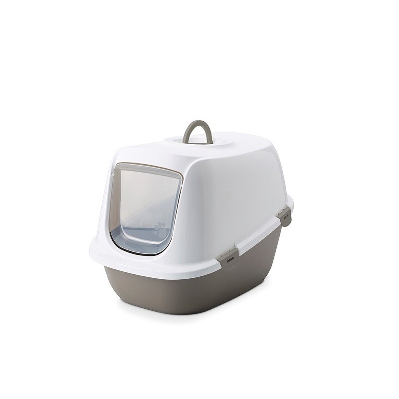 Leo model covered cat litter box. Carbon filter to neutralize odors. With a handle on the top. Transparent hinged door. Dimensions: 64 x 46 x 45 cm. Color: gray and white.