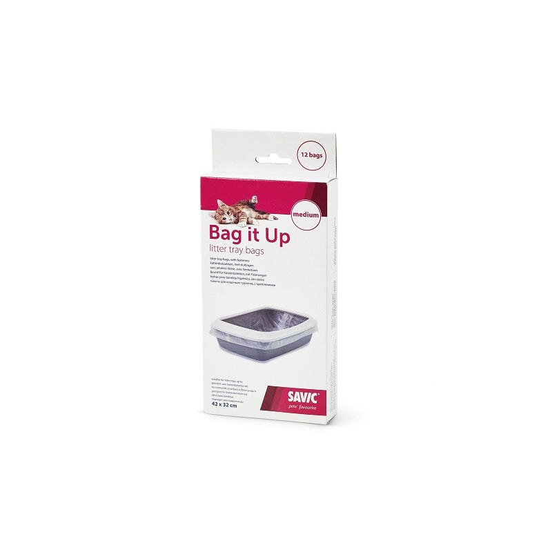 Heavy-duty Bag it Up medium-sized liners for litter boxes and cat litter trays. Prevents urine buildup and unpleasant odors. Dimensions: 42 x 32 cm. Pack of 12 liners.