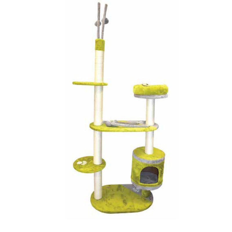 Twinbee triple-height castle-style scratching post with shelter. Kiwi green. Dimensions: 60 x 40 x 113 cm.