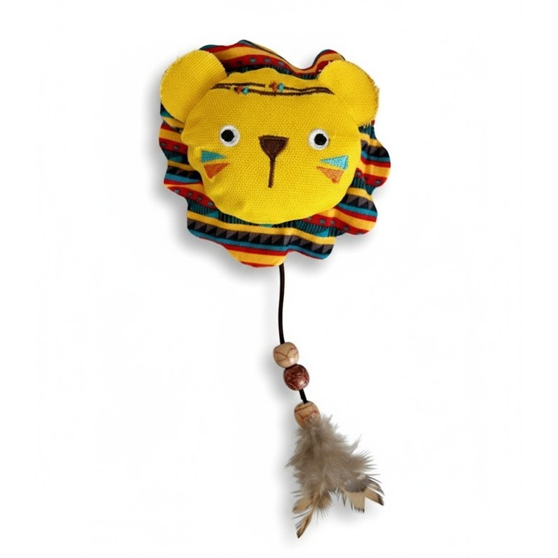 Lion-shaped plush toy filled with catnip and matatabi for double stimulation. Lightweight and made of durable fiber , it includes a tail with a cord, wooden beads, and a natural feather to enhance indoor hunting.