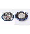 Striped stainless steel feeder. Non-slip base. Blue silicone coating. Diameter: 16 cm.