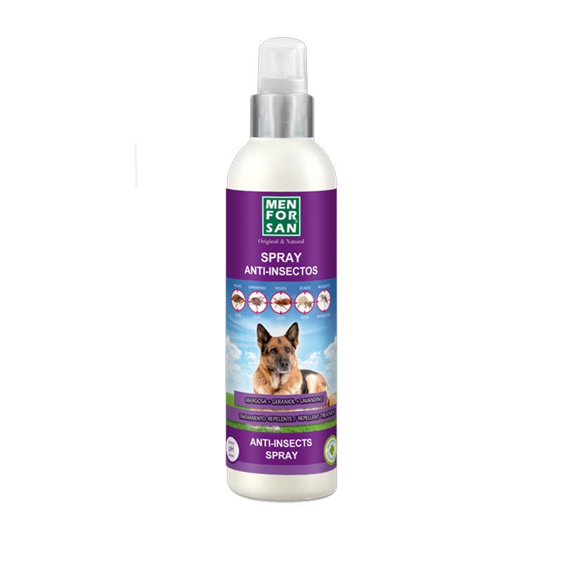 Dog spray with natural active ingredients: neem, geraniol, and lavandin oil. Neem acts as an anti-insect active ingredient on the skin and coat. Geraniol and lavandin prevent and repel infestations of all types of parasitic and flying insects. Suitable for all types of dogs, including puppies and pregnant females.