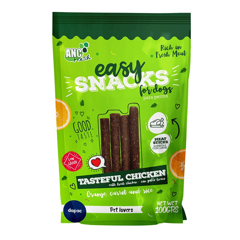 Easy Snacks Tasteful Chicken. Chicken bars for dogs. Slow-cooked to maintain the flavor and nutrients of each ingredient. Low in grains. Weight: 100 g. We recommend ordering in multiples of 150 units to ensure they come with a protective box.
