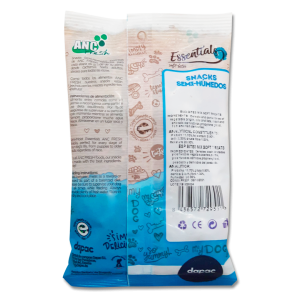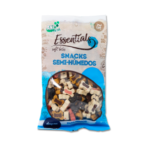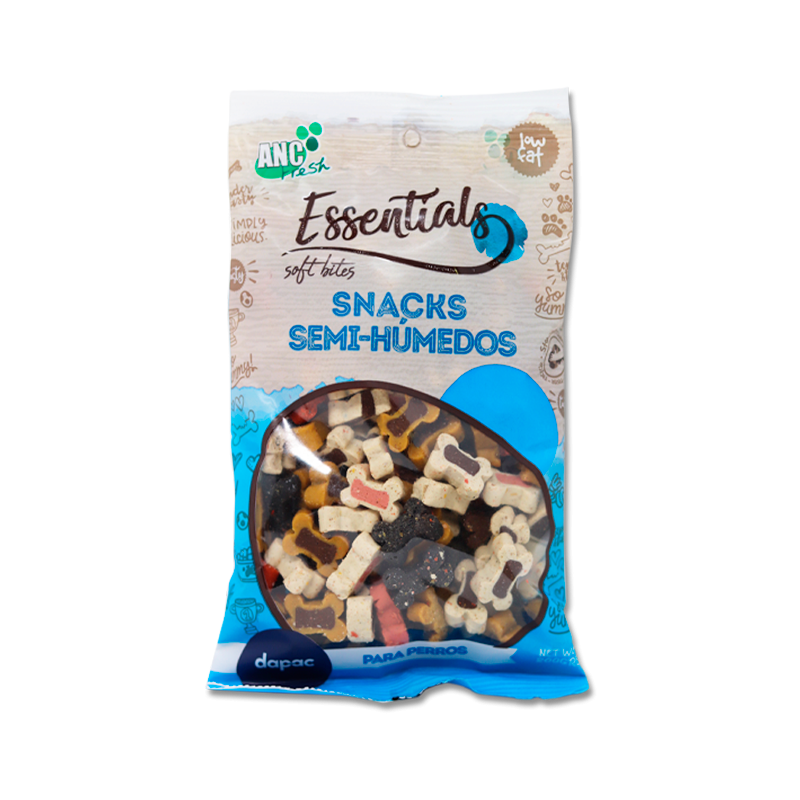 Fresh Essentials semi-moist dog treats with filled bones and hearts . Assorted bone and heart shapes. Perfect for taking anywhere on the go. 85g container. Suitable for puppies and adult dogs. Order in multiples of 6 to include an outer protective box. 85g bag.