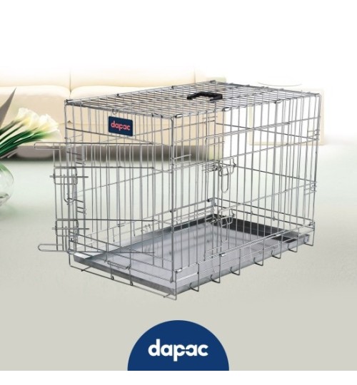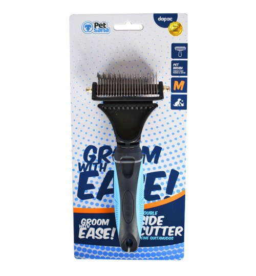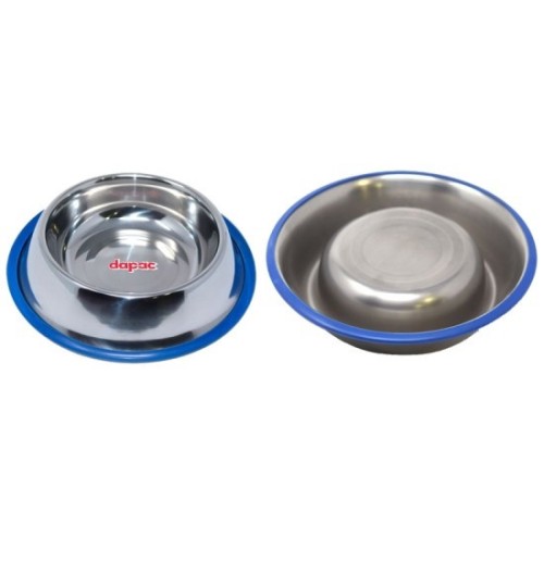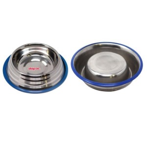 This stainless steel feeder features a non-slip base and a blue silicone coating on the bottom with striped patterns. It has a diameter of 17 cm.