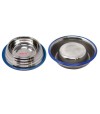 This stainless steel feeder features a non-slip base and a blue silicone coating on the bottom with striped patterns. It has a diameter of 22 cm.