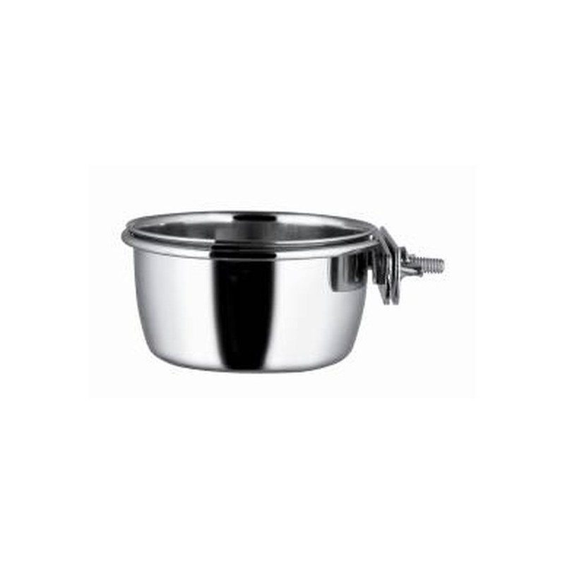 This stainless steel container serves a dual purpose: feeder and waterer. It features a hanging hook and is 16 cm in diameter.