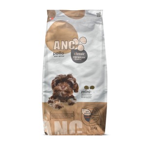 Complete food for adult dogs of small or mini breeds, ANC New Classic Mini. Main ingredients: chicken and rice. High digestibility and palatability. 15-kilogram serving size.