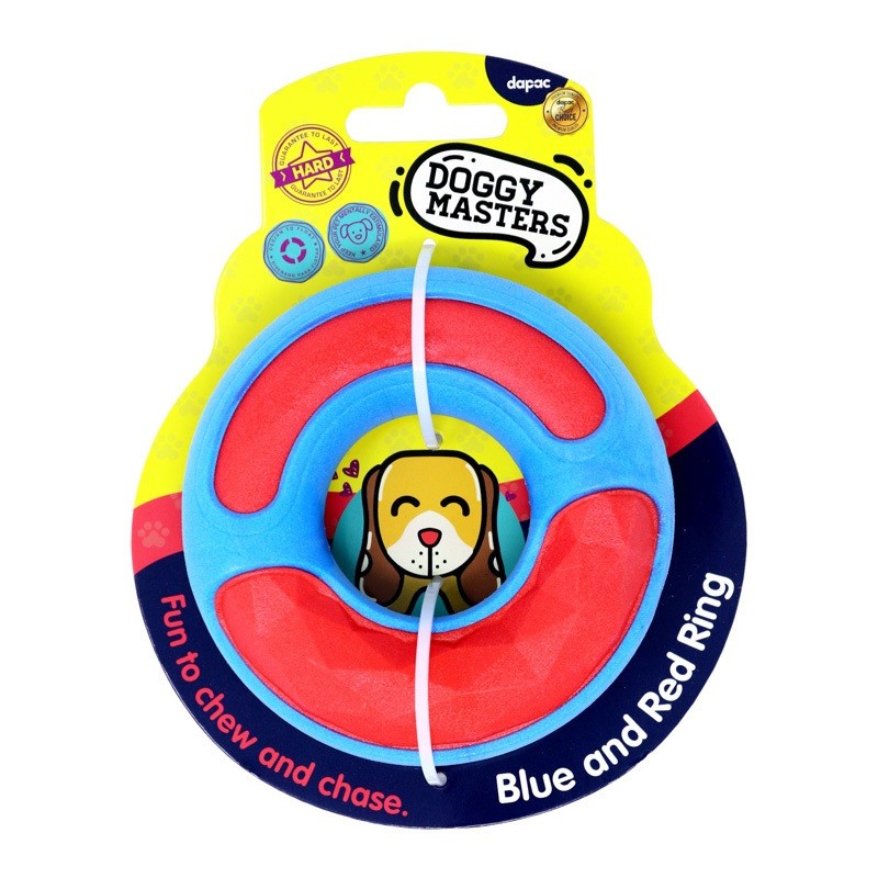 Blue and red Doggy Masters ring. This toy is perfect for dogs, keeping them mentally stimulated. This model is designed to float. Diameter: 12 cm.