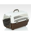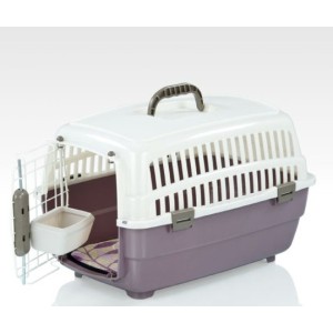 The Voyager Medium Lux carrier is a transport item for dogs and cats. It is gray and white, with a metal door, a food/water bowl, and a removable top. Its dimensions are 54 x 35 x 34 cm.