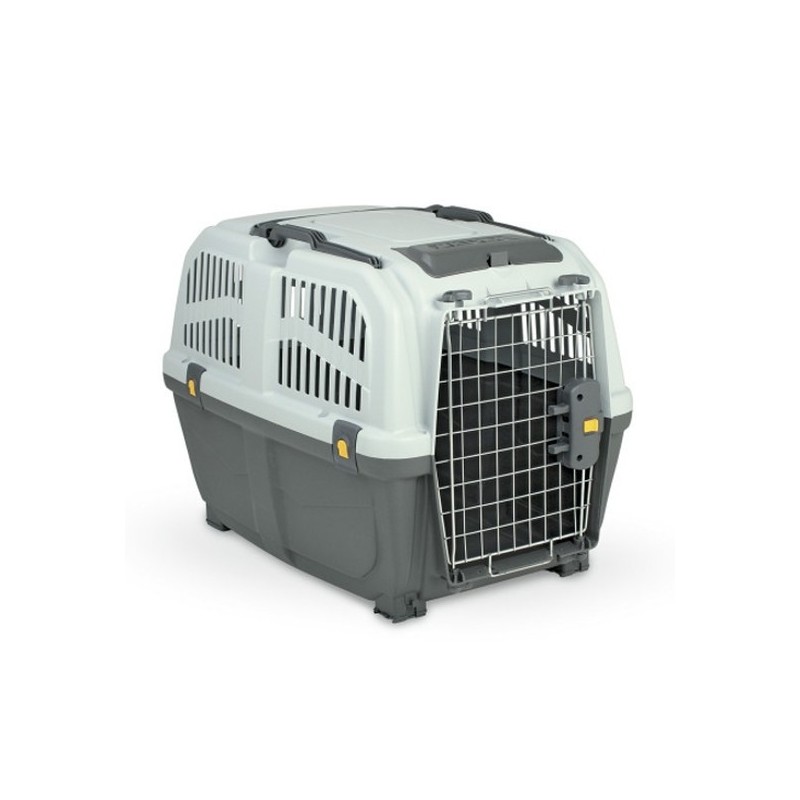 The Twinbee Skudo 7 IATA carrier is suitable for transporting dogs and cats. It is approved for air travel, in accordance with IATA air transport regulations. It is a secure carrier, featuring a metal door and a double-clip safety lock. Its dimensions are 105 x 73 x 76 cm.