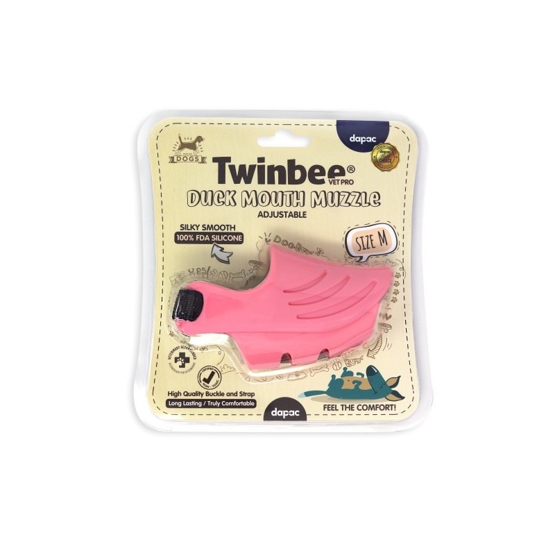 The Twinbee Premium FDA silicone muzzle provides safety and comfort for small and medium-sized dogs. This model is pink and size M. It feels comfortable and won't chafe the dog. Measurements: 121 x 170 x 73 mm.