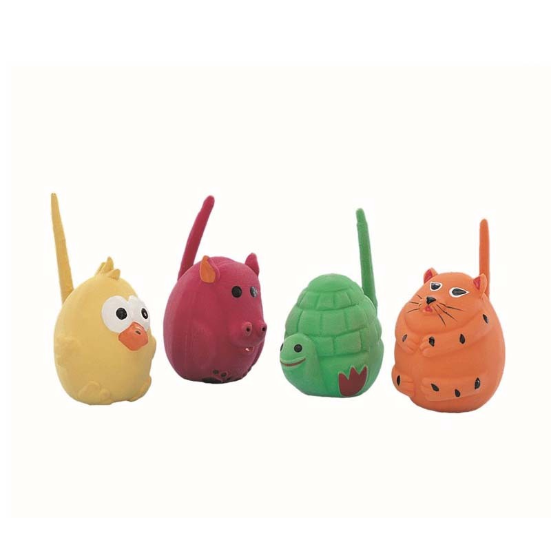 Toys shaped like a turtle, cow, cat, and bird. Made of latex. Size: 6 cm.