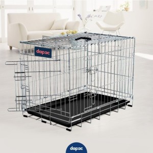 Double folding cage, chrome-plated zinc in black. It comes with a plastic tray. It has rounded corners for greater protection for your pet, two locks on each door, is lightweight, has a safety lock, and has a large handle for easy transport. Its dimensions are 76 x 48 x 55 cm.
