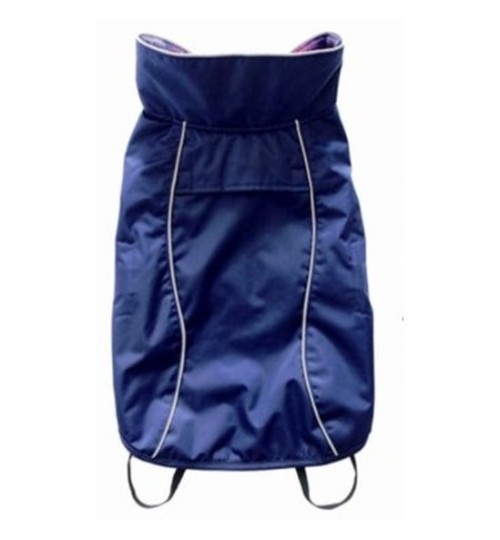Blue Harness Jacket dog coat. Water-resistant. Fleece lining. Size XS. Measurement (from neck to base of tail): 25 cm.