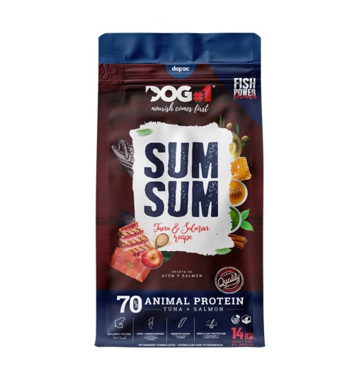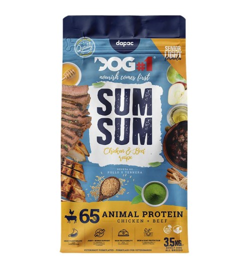 DOG#1 Sum Sum Chicken and Beef Light Recipe. Adult and senior dogs. Joint protectors. 65% animal protein. Highly digestible. Protects bones and joints. Protects coat and fur. 3.5 kg.