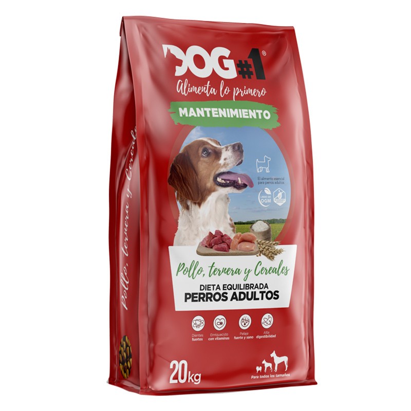 Complete food for adult dogs of all breeds. Enriched with vitamins, strong and healthy coat. Highly digestible. Strong teeth. GMO-free. No artificial preservatives. 20 kg size.