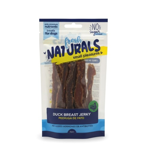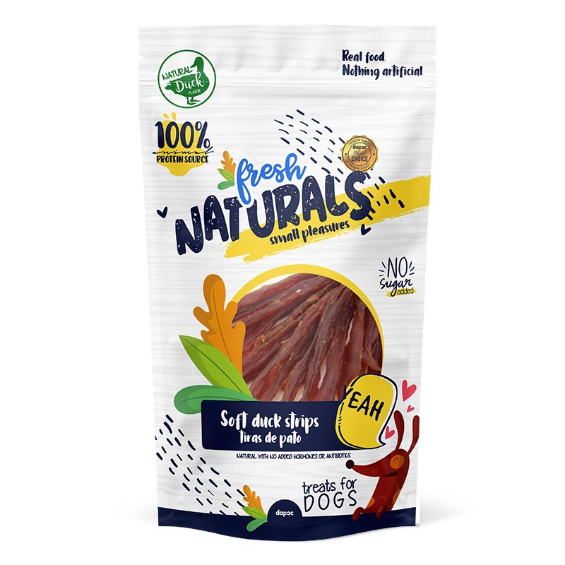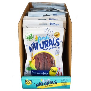Fresh Naturals Duck Strips Natural Dog Treats. Made with 100% animal protein. Hormone- and antibiotic-free. Gluten-free and sugar-free. Ingredients: duck, vegetable glycerin. 100g zip-top bag.
