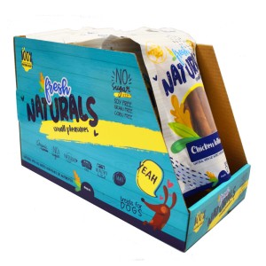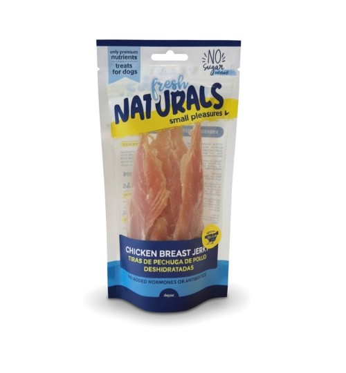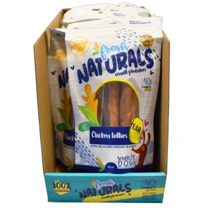 Fresh Naturals Chicken Lollies, Chicken Mikados Dog Treats. 100% animal protein. Hormone- and antibiotic-free. Gluten- and sugar-free. Ingredients: chicken, vegetable glycerin. 100g zip-lock bag.