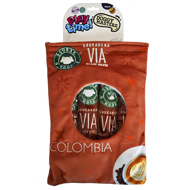 Doggy Masters individual mini coffee sachet-shaped toys for dogs. Made of velvet-effect fabric. Safe and durable. Assortment of 4 toys. Squeaks when squeezed. Bag dimensions: 58 x 40 x 26 cm.