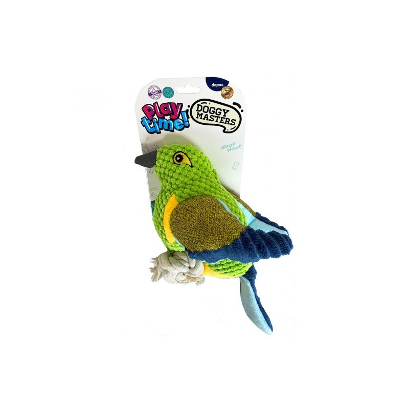 Play Time Doggy Masters green hummingbird plush dog toy. With a loop at the bottom for use as a tug toy. Safe and durable. 30 cm. Squeaky sound when pressed.