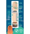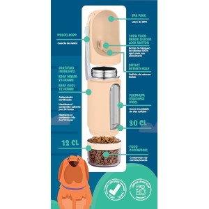 2-in-1 set to keep your companion hydrated and fed on walks, trips, or hikes. Includes a stainless steel thermos for hot or cold water and a lower container for snacks or food. Compact, lightweight, and easy to carry.