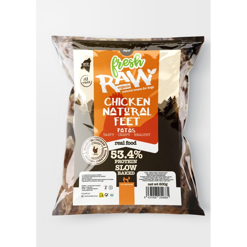 Fresh Raw Chicken Feet, a natural dog snack. Perfect for maintaining good oral health, 53.4% protein. Crunchy (very sensory for dogs). The bag contains 30 pieces (approx.). Measures approximately 12-14 cm.