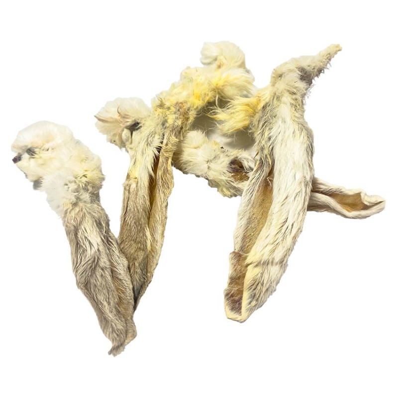 Fresh Raw Rabbit Ears with Fur. Perfect for maintaining good oral health. 59.7% protein. Crunchy (very sensory for dogs). Bulk format. 375 units (approx.). Display -friendly format . Approx. 20 cm.