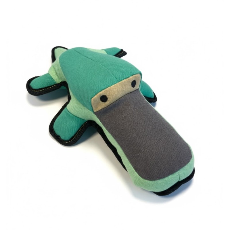 Textile plush designed for active play and mental stimulation . Made of durable canvas with reinforced seams and piping , it combines a soft body with an easy-to-grip shape for biting, shaking, and carrying . Fun green design with a gray "beak."