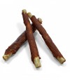 Chewy snack where a strip of duck wraps around a rawhide stick . Crunchy & chewy texture: crunchy at first and then becomes chewy, ideal as a reward . No added sugar , hormones, or antibiotics .