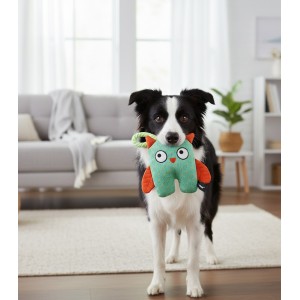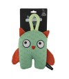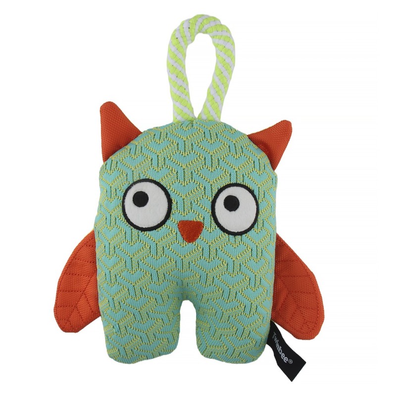 Plush owl-shaped dog toy with a squeaker inside when squeezed and a crunchy wing sound. Durable fabric; built-in top handle. Ideal for tossing and gentle chewing.