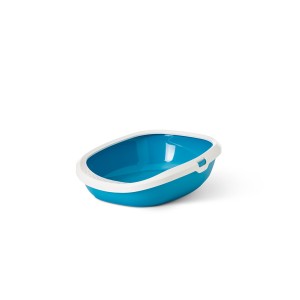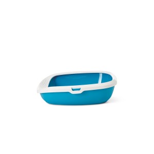 Gizmo Medium Open Top Litter Box in White and Twilight Blue. Front holes to prevent litter from falling out of the box. Low-profile entrance for easy access. Dimensions: 44 x 35.5 x 12.5 cm.