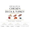 Super-premium food for adult dogs of all breeds, featuring fresh chicken, duck, and turkey as its main ingredient. 80% animal protein, 60% real meat, 20% fruits and vegetables, and 0% grains . 2.5 kg size.