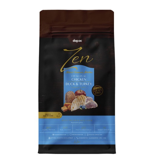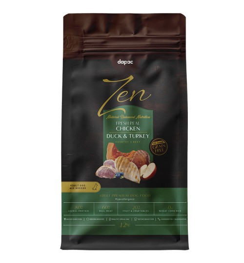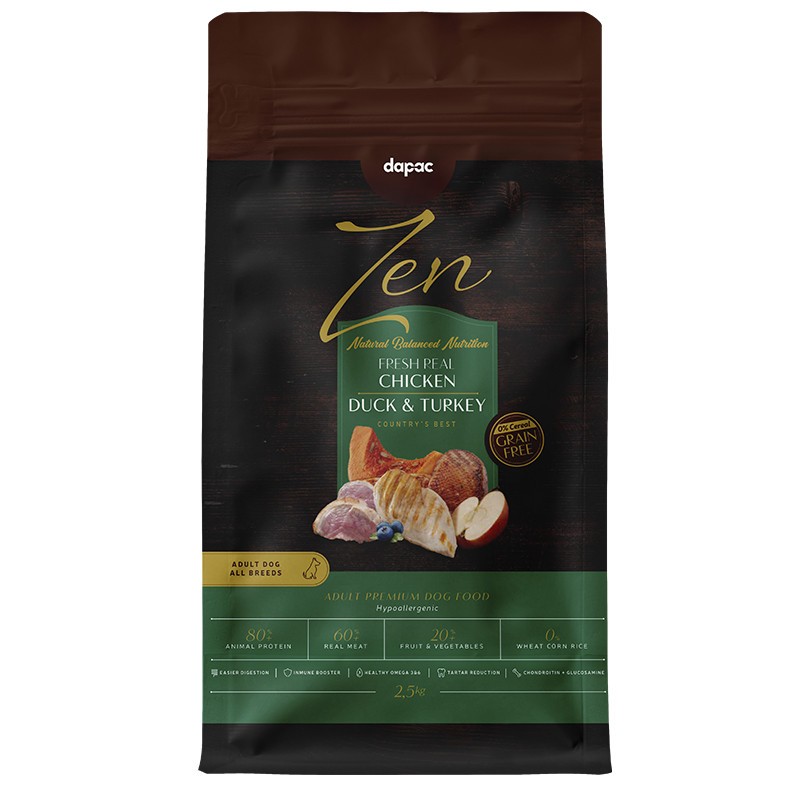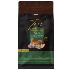 The Zen Country's Best Chicken, Duck, and Turkey variety belongs to the Zen Natural Balanced Nutrition Grain-Free line of super-premium foods. A recipe featuring fresh chicken, duck, and turkey. The formula is based on 80% animal protein, 60% real meat, 20% fruits and vegetables, and 0% grains.
