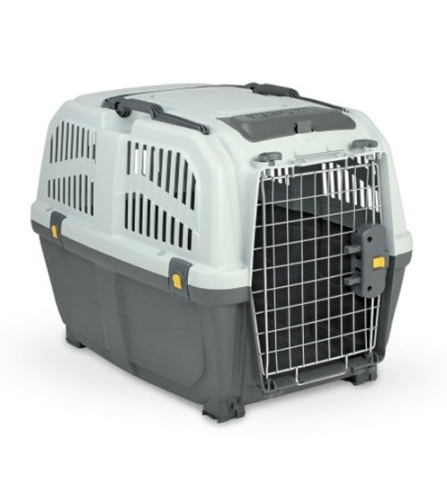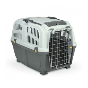 The Twinbee Skudo 2 IATA carrier is suitable for dogs and cats. It is approved for air travel, complying with IATA air transport regulations. It is a secure carrier, featuring a metal door and a double-clip safety lock. Its dimensions are: 55 x 36 x 35 cm.