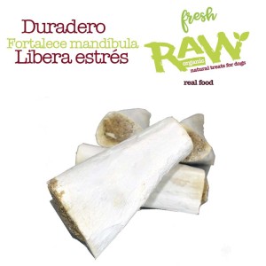 Fresh Raw Bleached Buffalo Stuffed Bone. Baked, bleached buffalo stuffed shin bone. 25% protein. Strengthens the jaw. Combats bad breath and tartar. Acts as a natural anxiolytic, as gnawing on the bone releases stress and anxiety. Also available in single-unit format . Measurements: 12-15 cm. The box contains 10 units (approx.).
