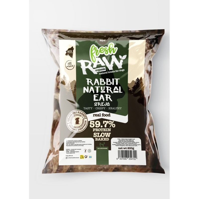 Fresh Raw Rabbit Ears. Perfect for maintaining good oral health. 59.7% protein. Crunchy (very sensory for dogs). 200g size. The bag contains 20 pieces (approx.). Approx. 20cm in size.